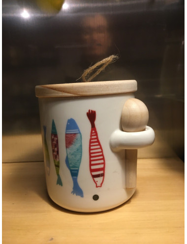Nouvelle Collection de pot à sel Motif Sardines proposé avec sa cuillère en bois.
