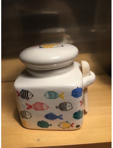 PROMOTION sur la Nouvelle Collection de pot à sel Motif Poissons proposé avec sa cuillère en bois.